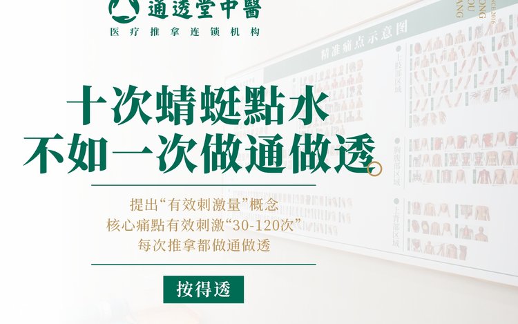 通透堂精准痛点推拿疗法将传统中医与现代解剖学相结合,突破了人体痛点盲区,科学锁定人体常见、核心、潜在痛点部位,全面总结了人体“痛点”与现代常见70余种疾病、慢性疾病之间的关系,可以快速找到“病灶点”,让治疗更精准、高效。它将中医传统穴位推拿迭代升级,实现了传统“缓解型推拿”向直达病灶、消除病根的跃升