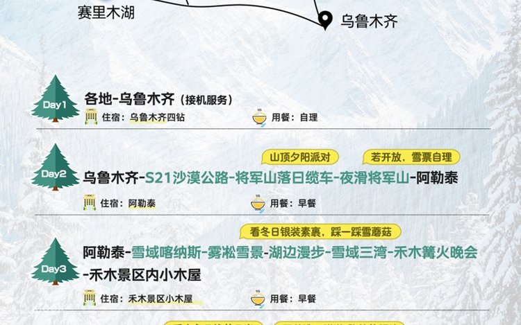 - 优惠政策:冬季新疆部分景区门票(喀纳斯/禾木/将军山)已享受淡季优惠/免票政策,此跟团报价已减免,任何证件在当地不再享受优惠,无差价可退。赛里木湖景区如持有现役退役军人、残疾人、其他特殊证件,请报名时告知并携带相关证件(如未携带无法帮您安排退费),且喀纳斯+禾木+白哈巴冬季执行套票政策,只要游览其中一个景点,其他两个景点不管游览与否,都无退费;